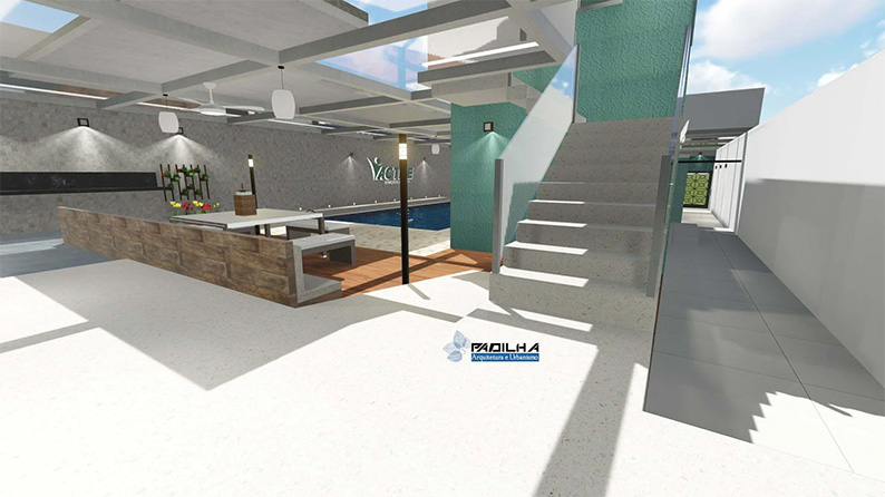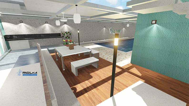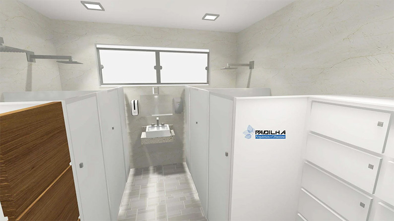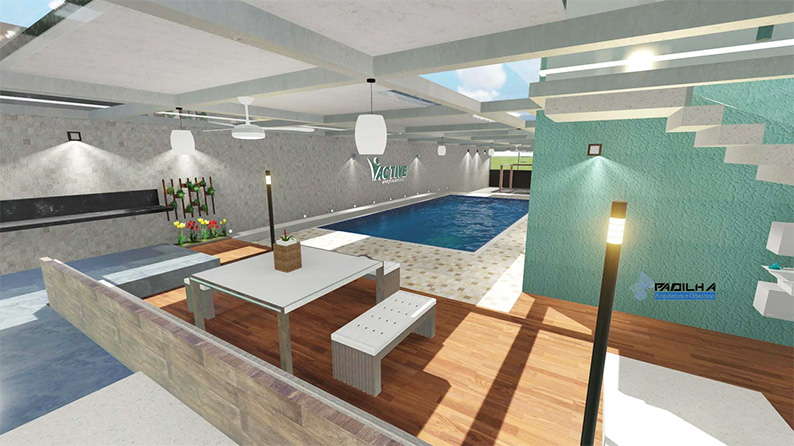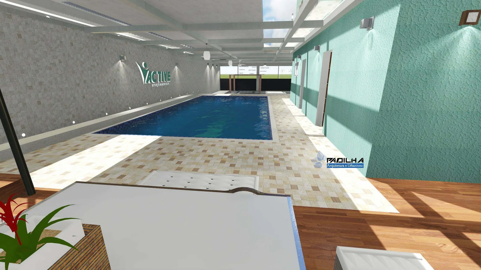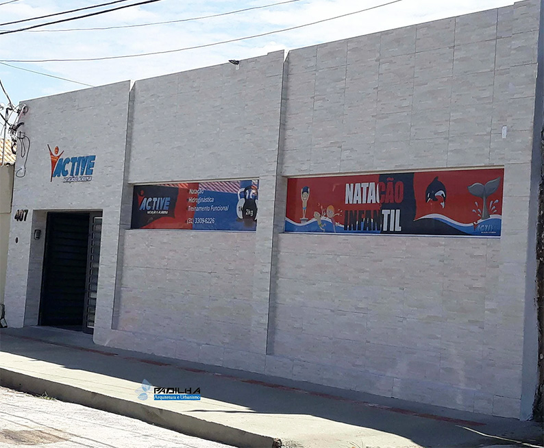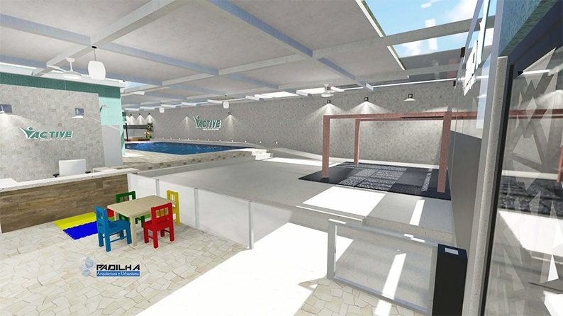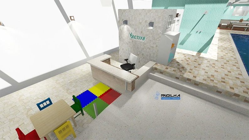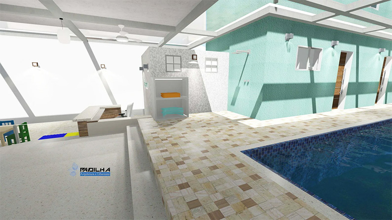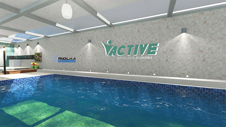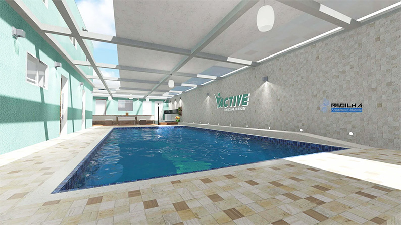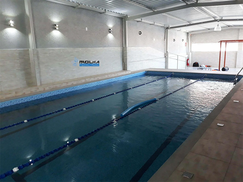 Com piscina ampla, vestiários, banheiro acessível, espaço para lazer e recepção.